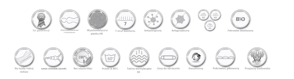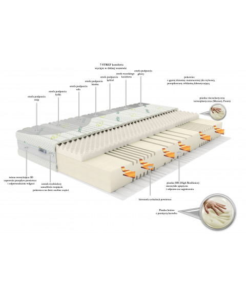 7 stref komfortu, dwustronny (nie używamy kleju, więc łatwo po odwróceniu dolnej, grubszej warstwy pianki - HR ponownie ułożyć warstwę piankę Visco), antyalergiczny, antygrzybiczny, dwie twardości) |
