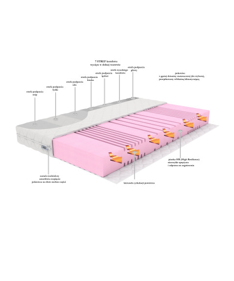 Dzięki wykorzystaniu wysokoelastycznej pianki HR wyciętej strefowo materac polecany jest dla osób z problemami kręgosłupa. Doskonale sprawdzi się także dla czynnie uprawiających sport. |