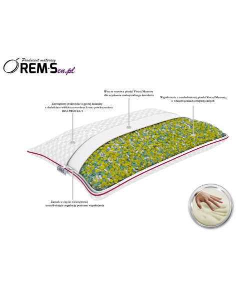Poduszka MEMORY LUX wypełniona jest granulatem pianki Visco/Memory o gęstości 50kg/m3, dzięki czemu idealnie dopasowuje się do kształtu naszej głowy, nawet przy intensywnej zmianie ułożenia ciała. Nie wymusza na nas stałego utrzymania głowy w jednej pozycji, jak to ma miejsce na poduszkach profilowanych, rozluźnia mięśnie karku i odciąża szyjny odcinek kręgosłupa.