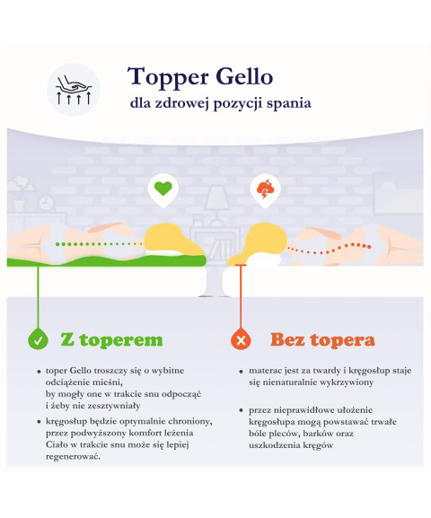 Topper GELLO to luksusowy materac nawierzchniowy o grubości 6-7 cm, który możesz rozłożyć na posiadany materac, kanapę, niewygodną wersalkę lub w dowolnym miejscu domu. Składa się na niego termoplastyczna pianka żelowa , którą zaprojektowano aby zapewnić idealną temperaturę i komfort podczas snu . Posiada ona otwarte komórki, które pozwalają na optymalną cyrkulację powietrza przez cały rok, a latem nawet uczucie chłodu. Olbrzymia gęstość i elastyczność tego surowca pozwalają natomiast doskonale podpierać stawy i mięśnie przez całą noc. Nakładka optymalnie dostosowuje się do spoczywającego ciała, co prowadzi do ortopedycznego odciążenia kręgosłupa. Dopełnieniem całości jest finezyjnie pikowany pokrowiec, z czterostronnym zamkiem i gumami zapewniającymi doskonałe utrzymanie toppera na materacu, oraz trokami umożliwiającymi zwinięcie go